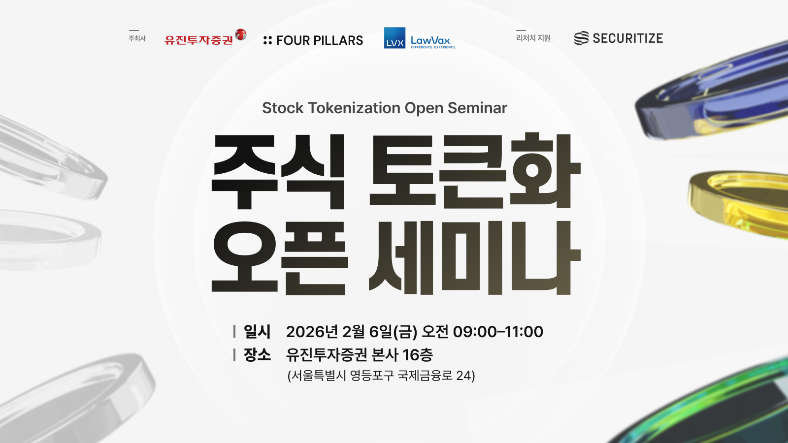 Four Pillars will co-host the “Stock Tokenization Open Seminar” with Eugene Investment & Securities and the law firm Lawvax on Friday, February 6, 2026, from 9:00 AM to 11:00 AM, at the 16th floor of Eugene Investment & Securities headquarters (24 Gukjegeumyung-ro, Yeongdeungpo-gu, Seoul). This open seminar was organized to review the institutional issues and practical applicability of stock tokenization in Korea amid the rapidly evolving global capital markets infrastructure, and to discuss business models and execution strategies that market participants can reference in practice.